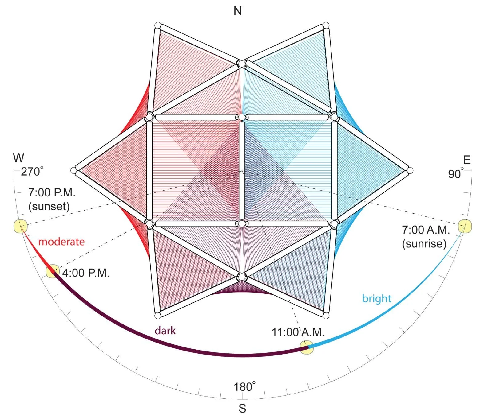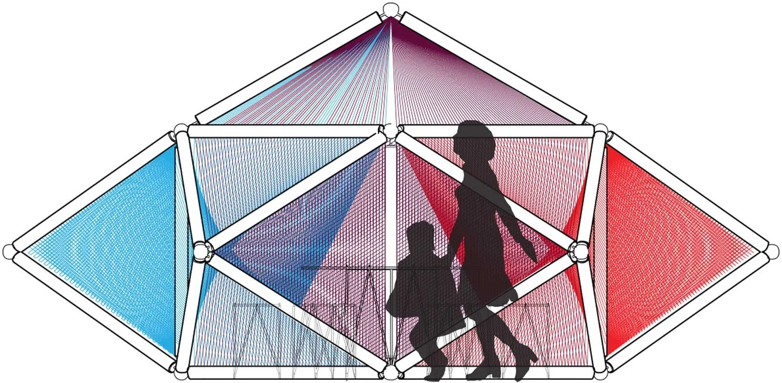 The Ohr Sukkah focuses on various conditions of light intensity and quality throughout the day to create environments that invoke particular experiences. Porous surfaces that diffuse light are formed by layering vertical strands of colored yarn. Occupants inhabiting the sukkah will feel refreshed through the refraction of bright morning light from the blue yarn; they will feel calm through the absorption of intense afternoon light from the purple yarn; they will feel content through the reflection of warm evening light from the red yarn.