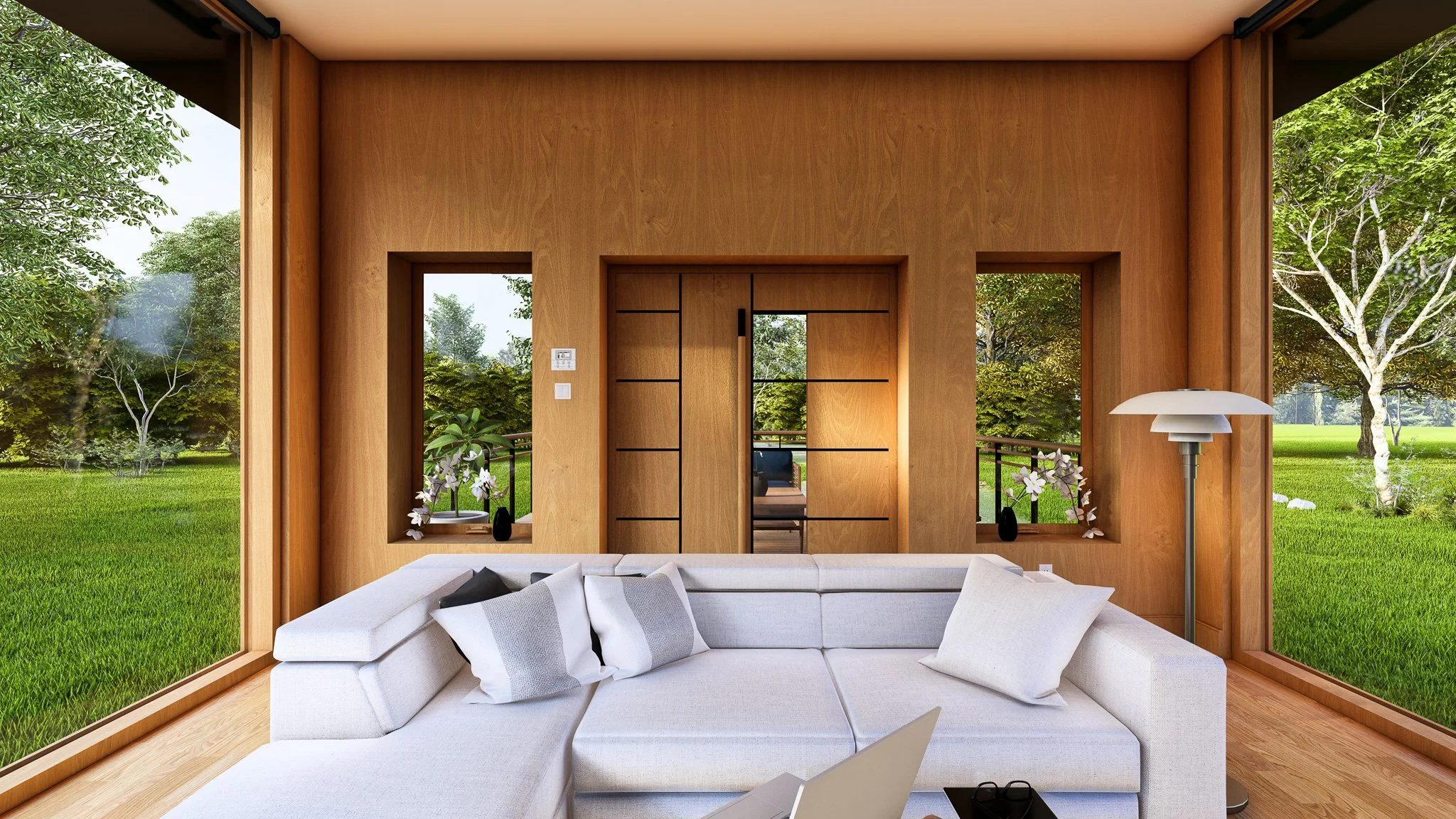 Modern Forest Cabin is designed as a simple home that’s intended to be built on a property surrounded by nature and full of privacy. This 1,200 square foot 1 bedroom 1 bathroom house has tall floor to ceiling windows with bird-safe micro frits that look out towards the forest outside. It has cozy spaces that go from common places to gather to more private areas like the bathroom and bedroom. Modern Forest Cabin is designed to be a vacation home where you can escape the noise of a city and be surrounded by nature.